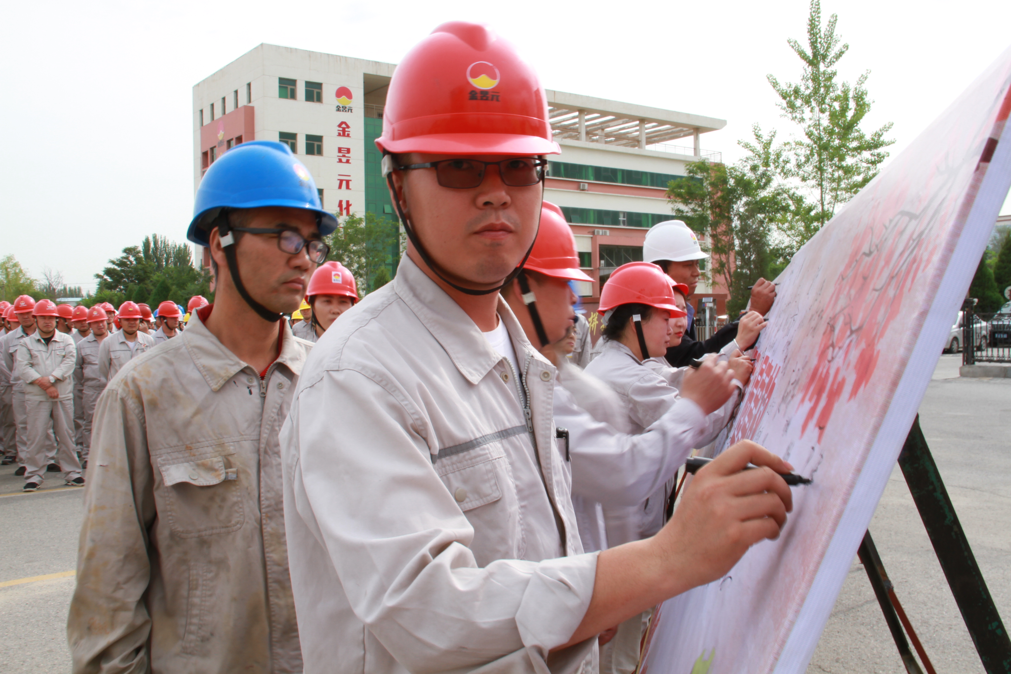 2019年6月4日8點40分許,寧夏金昱元化工集團青銅峽片區安全生產月宣傳動員及“安全生產月”活動啟動儀式即將召開。能源化學公司廠門口各色彩旗迎風招展,青銅峽片區安全生產部精心制作的一塊塊各類安全生產知識宣傳展板排列整齊一字排開,片區全體日勤人員著裝統一,列隊整齊,氣氛莊嚴肅靜。