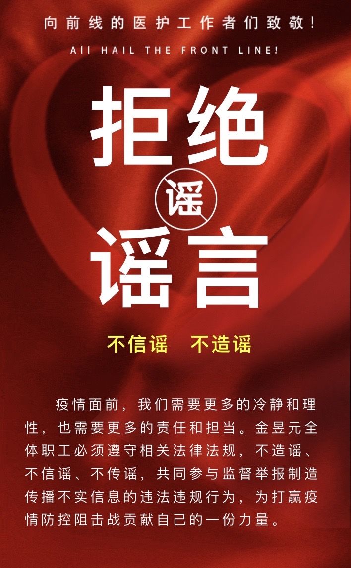 自新型冠狀病毒疫情阻擊戰打響以來,金昱元全體職工團結一心,眾志成城、抗擊疫情,一股股愛的暖流匯聚成了打贏疫情防控阻擊戰的強大力量。