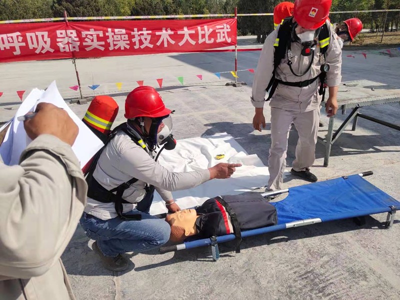 此次比賽以事故演練的方式進(jìn)行,由于2#密閉電石爐煤氣管道發(fā)生泄露,對(duì)事故泄露現(xiàn)場(chǎng)煤氣中毒人員進(jìn)行急救作為評(píng)比范圍。比賽開始時(shí)由參賽選手對(duì)氣瓶、呼吸器、減壓閥,面罩,背托等完好性進(jìn)行檢查。
