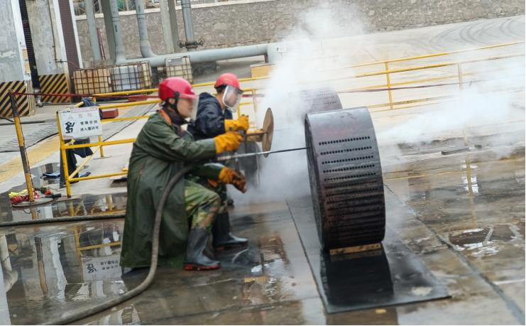 檢修已經(jīng)是第三天,接近尾聲,大家似乎已經(jīng)疲憊,但是行動(dòng)上未松懈。今日的氯化氫小廣場(chǎng)上格外熱鬧,7:20,班長已經(jīng)開始準(zhǔn)備今日的檢修票證,為檢修項(xiàng)目做準(zhǔn)備。他的身影在朝陽地映射下顯得那么著急,沒有一點(diǎn)怠慢的意思,今天我們班組檢修的項(xiàng)目是提濃塔再沸器石墨塊疏通工作,這項(xiàng)工作看起來簡單,實(shí)際上是耐心地考驗(yàn)。一個(gè)個(gè)細(xì)小的石墨孔需要用蒸汽一個(gè)一個(gè)疏通,檢修開始之前還是和往常一樣,安全教育是少不了的,班長一遍遍強(qiáng)調(diào)防護(hù)用品規(guī)范佩戴以及疏通過程中的安全注意事項(xiàng),在準(zhǔn)備工作結(jié)束后,今天的檢修工作開始了。