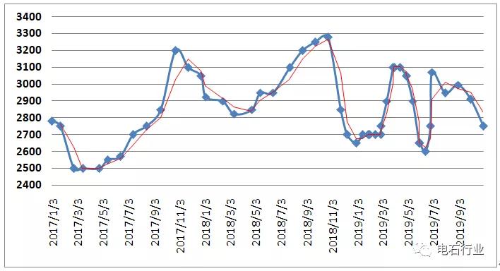 2019年電石市場(chǎng)波動(dòng)不同于2018年,價(jià)格出現(xiàn)了連續(xù)快速的波動(dòng),漲跌幾乎無任何喘息時(shí)間,主要受到供需持續(xù)波動(dòng)的影響。前半年經(jīng)歷大幅漲跌,上漲時(shí)連續(xù)大漲,漲幅超過600元/噸,下跌時(shí)快速下移,降幅跌破成本線后再度下行400元/噸,回吐了全部漲幅;三季度電石價(jià)格呈現(xiàn)“N”字型走勢(shì),先漲后跌再漲,變化幅度略小于上半年:7月價(jià)格前漲后穩(wěn)月底局部小幅下調(diào),多數(shù)時(shí)間慣性上漲200-300元/噸,隨后月底局部?jī)r(jià)格下調(diào)50元/噸左右;8月份價(jià)格下行200-300元/噸,回吐前期漲幅;9月份價(jià)格再度反彈,至月底已反彈了150-250元/噸不等;10月電石價(jià)格再次極速下滑300元/噸,1-10月電石價(jià)格呈現(xiàn)“M”字型,回落到當(dāng)前主流價(jià)格的2550-2650元/噸。
