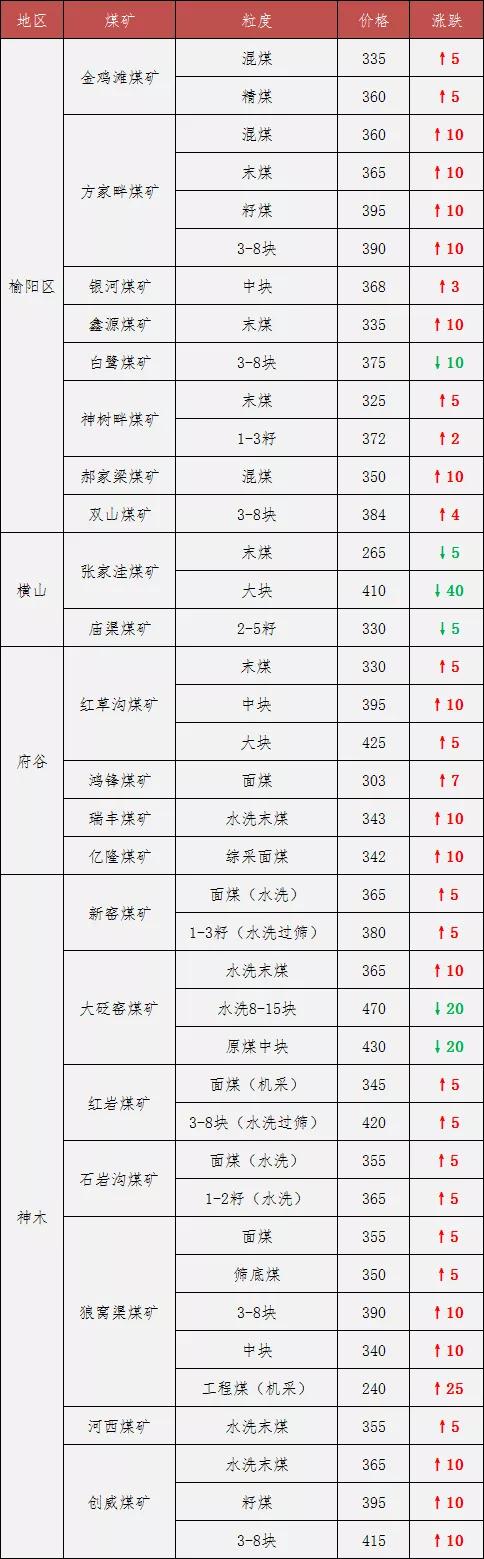 榆林煤價(jià)繼續(xù)漲:18家煤礦上調(diào)價(jià)格5-10元/噸 周末至今,榆林18家煤礦又上調(diào)價(jià)格。據(jù)榆林煤炭交易中心數(shù)據(jù)顯示,截止目前,榆陽區(qū)(6000k 0.6S)動(dòng)力煤均價(jià)為357元/噸,環(huán)比上漲6元/噸;神木(5800k 0.4S)動(dòng)力煤均價(jià)為339元/噸,環(huán)比上漲5元/噸;府谷(5500K 0.4S)動(dòng)力煤均價(jià)為322元/噸,環(huán)比上漲7元/噸。 最新調(diào)價(jià)煤礦: