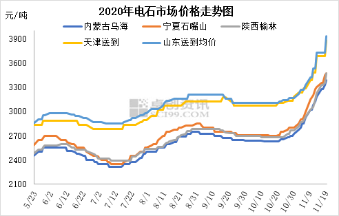 整體市場描述:上周五至今電石價格繼續快速上漲,各地采購價連續上調300-400元/噸,電石出廠價上調200元/噸左右,且烏海及周邊貿易出廠價推出了明日繼續上漲100元/噸計劃。至此,10月下旬至今,電石價格已連續上調了700-800元/噸,達到2011年9月以來的最高水平。本周電石價格仍在繼續上調,主要仍因供需失衡,貨源緊俏推動。內蒙古地區電石仍頻繁有不同程度的限電現象,產量不足,寧夏石嘴山地區受重污染天氣影響,本周后期有電石爐降負荷現象,外加其它復工電石爐恢復緩慢,電石增量較為有限;但PVC價格仍在連續上漲,前期停車PVC企業也有復產,整體開工高位,部分甚至超負荷運行,外加冬季來臨前對電石也有補庫需求,整體需求維持高位,綜合導致電石貨源持續緊張,價格得以連續上揚。