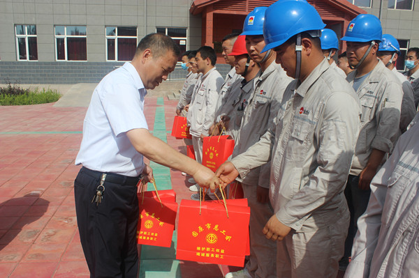 7月8日上午,固原市總工會常務副主席王志賢、開發區總工會常務副主席羅天、開發區管委會規劃建設局副局長海濱一行,蒞臨寧夏金昱元化工集團股份有限公司固原片區,為堅守在生產一線的員工送來防暑降溫用品。