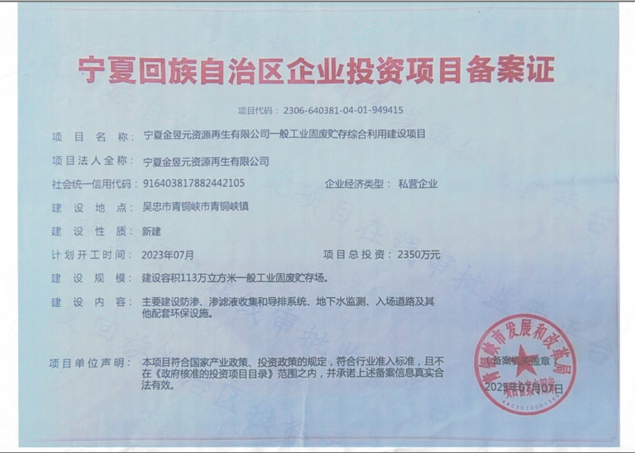 寧夏金昱元資源再生有限公司一般工業固廢貯存綜合利用建設項目環境影響報告書公眾參與初次公示