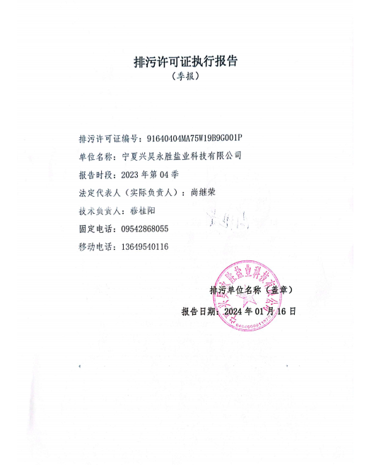 寧夏興昊永勝鹽業(yè)科技有限公司2023年第4季度排污許可執(zhí)行報告